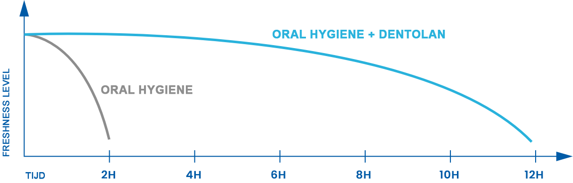 As the chart shows, Dentolan in combination with oral hygiene can achieve a much longer freshness effect compared to oral hygiene alone.